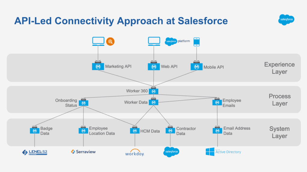 Además de esto, MuleSoft permite la integración de cualquier sistema CRM como Salesforce gracias al API-Led Connectivity. Este sistema es el opuesto a la integración punto a punto, ya que está basado en APIs reutilizables y funcionalmente completas. Esto la convierte en una solución totalmente escalable.