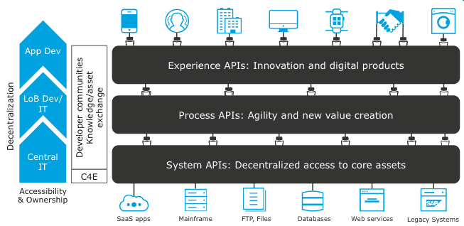 Por lo tanto, si antes se utilizaban sistemas punto a punto ahora la solución a través de APIs se conoce como API-led Connectivity. Este sistema utiliza tres tipos de API reutilizables y útiles para conectar datos y aplicaciones: APIs para desbloquear datos de sistemas, APIs para componer datos de diferentes sistemas en procesos más elaborados y APIs para brindar una experiencia rica a un usuario final.