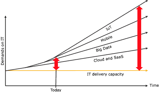 Además de esto, se sabe que la demanda de proyectos de IT aumentará en un 32% en los próximos años. Sin embargo, el presupuesto crecerá menos de un 10% lo que impedirá que el equipo pueda mejorar, crecer o innovar. De hecho, un estudio reciente a responsables de IT revela que estos dedican el 70% de su tiempo a “mantener las luces encendidas”.