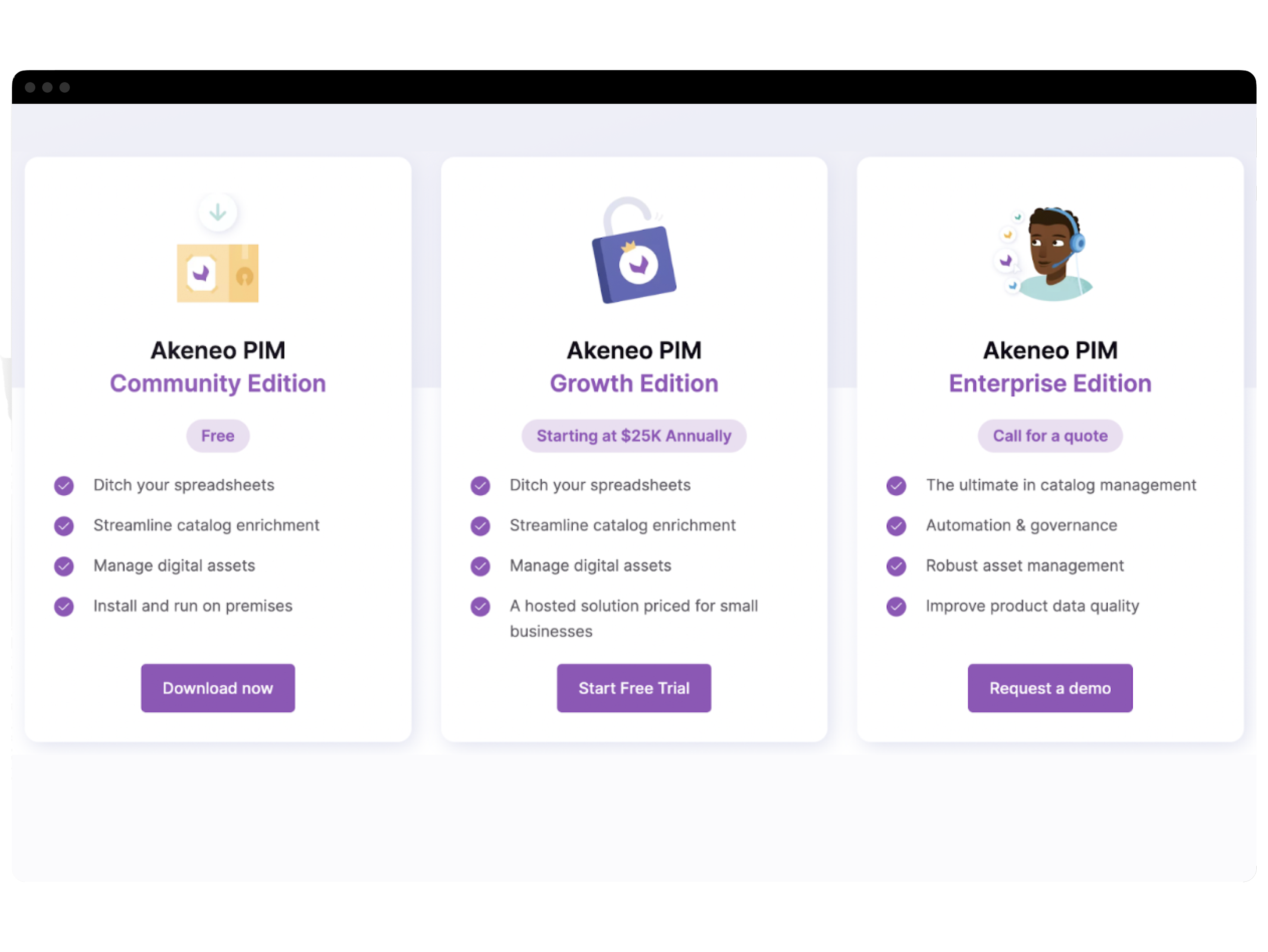 Akeneo tiene 3 ediciones, una gratuita y dos de pago: Community, Growth y Enterprise. En ese orden, cada edición incluye los beneficios de la anterior, a los que además se añaden un emocionante conjunto de características y capacidades nuevas.