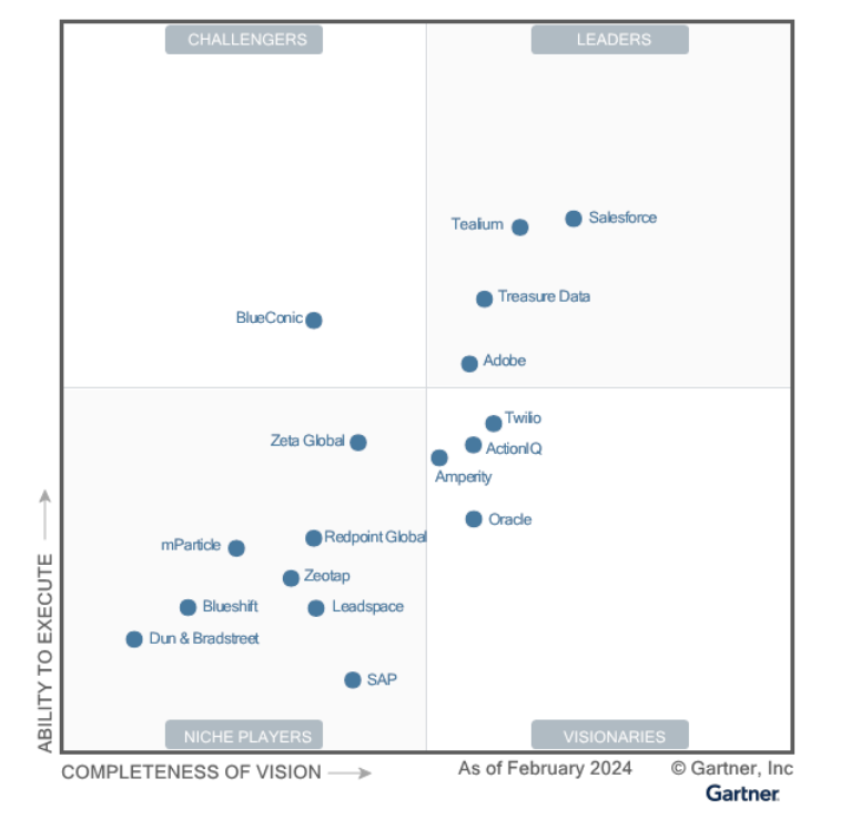 Además, según el informe Magic Quadrant de Gartner (2024), Salesforce se posiciona como líder del mercado en Multichannel Marketing Hubs. Este reconocimiento reafirma su fortaleza en la gestión integral del marketing multicanal. Esta posición privilegiada se debe a su capacidad para conectar datos, personalizar interacciones a gran escala y automatizar campañas de forma inteligente a través de diferentes canales.