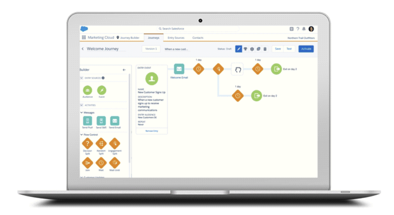 Una de las funcionalidades más potentes de Salesforce Marketing Cloud es Journey Builder, que permite diseñar recorridos automatizados para contactar al cliente en el momento adecuado, por el canal óptimo y con el mensaje más relevante. Gracias a esta herramienta, es posible guiar a cada usuario de forma personalizada a lo largo de todo el customer journey.