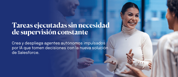 Agentforce es la nueva solución de Salesforce que permite crear y desplegar agentes autónomos, impulsados por inteligencia artificial, que toman decisiones y ejecutan tareas sin necesidad de supervisión constante.