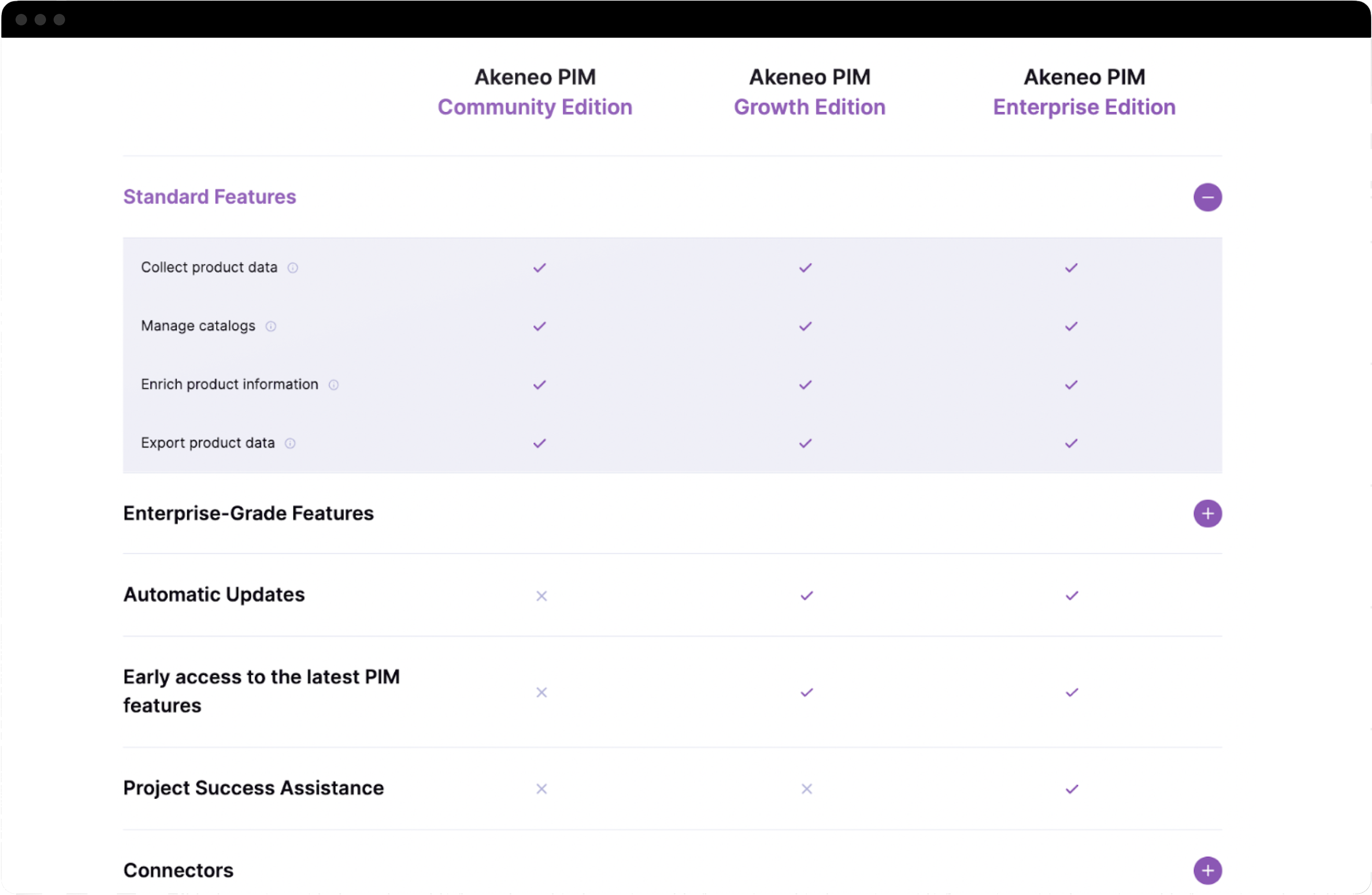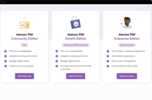Akeneo comes in three different editions, one free and two paid : Community, Growth, and Enterprise. In that order, each edition contains the benefits of the previous one plus its own new and exciting set of characteristics and capabilities.